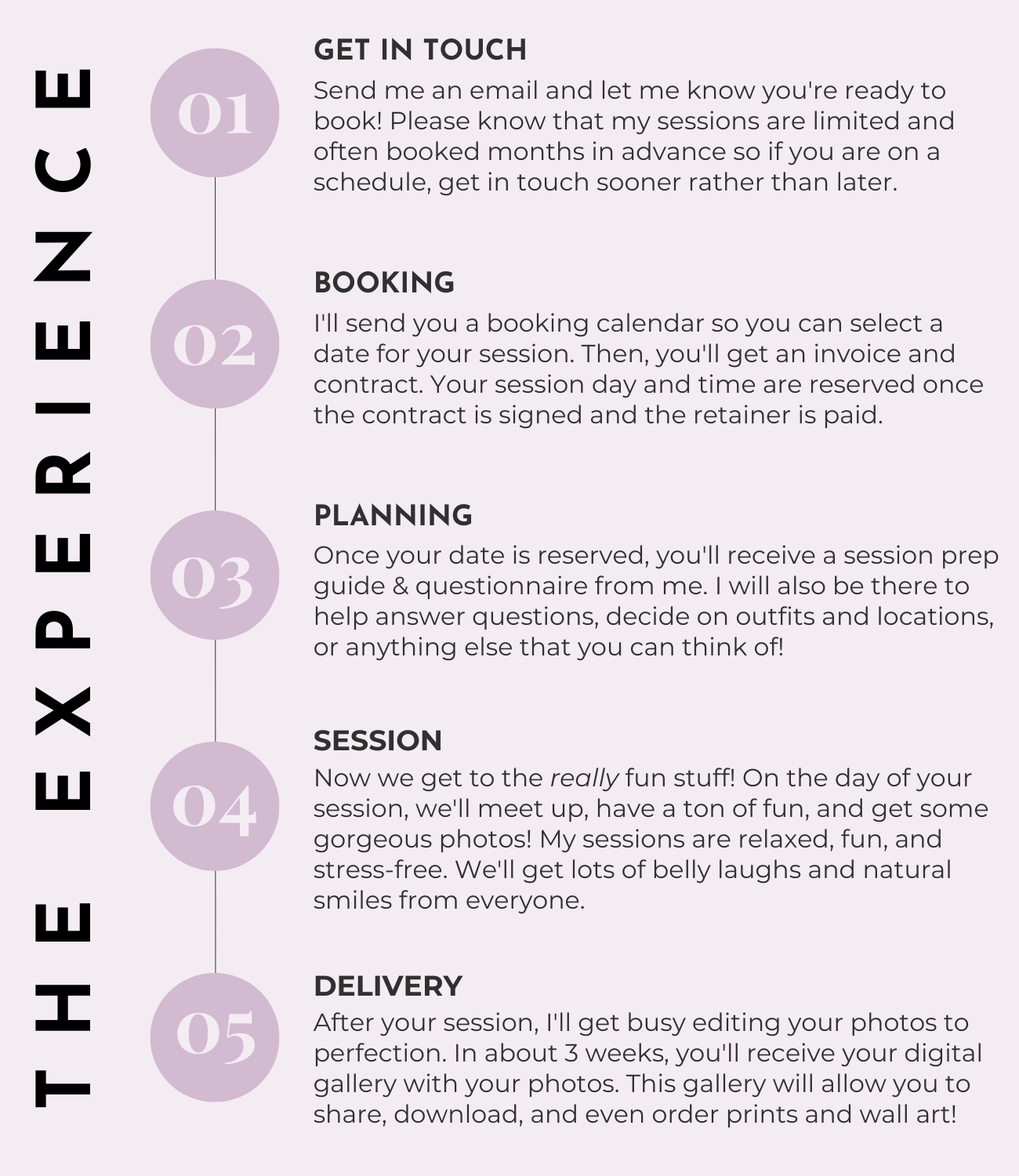 I'm so excited you're considering me for a portrait session! I'm here to help you through this entire process, from picking the right collection for you to helping with locations and outfits. It's important for me to make this as easy and stress-free as possible. I believe photo sessions should be a fun memory, not a stressful chore we dread! 💖
